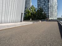 This is an image of a man riding a skateboard on a road outside a city building in Holland, Netherlands. The urban landscape showcases modern architecture and residential areas. The clear sky overhead adds to the aesthetics of the scene. The road surface is made of asphalt, creating a smooth path for the skateboarder. The surrounding trees and public spaces enhance the overall urban design of the area. This photo captures a typical day in the city life of Holland, showcasing its unique blend of modern architecture and European charm.