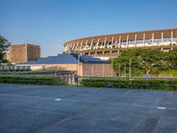 This stock photo captures the vibrant city life of Tokyo, Japan. The urban landscape is filled with skyscrapers, bustling streets, and a clear blue sky with scattered clouds. In the foreground, there is a dirt and gravel surface, which adds to the dynamic aesthetic of the city. The image showcases the urban design and modernity of Tokyo, as well as the presence of a sport stadium in the background. It is a perfect representation of the fast-paced and energetic atmosphere of this metropolitan city in Japan.