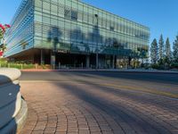Street view of a modern building in Los Angeles, California. The clear sky casts hard shadows on the road and urban design. Flower beds add a touch of color to the city landscape.