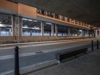 A night scene in an urban city. A bench sits on the curb near a parking garage and walkway. The empty building is illuminated by streetlights and artificial light. Concrete bridge and underpass add to the urban design.
