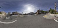 A straight asphalt road cuts through a suburban residential area in Los Angeles, USA. Clear sky enhances the urban cityscape, highlighting open spaces. It's a quintessential day in California's vibrant city.