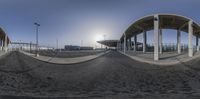 A black and white panoramic view of a bustling urban cityscape. Concrete structures, including a bus station, stand against the backdrop of a sunrise. The city's landmarks and transportation hubs are highlighted in this monochrome landscape.