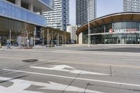 This stock photo showcases a stunning urban cityscape in Toronto, Ontario, Canada. The image features an empty street with buildings and an urban street scene in the background. The road is made of asphalt and has many white lines in it. The modern architecture and concrete structures give the city a contemporary look. The mixed-use buildings and high-rise condominiums are part of the bustling metropolitan area of Toronto. The clear sky and the well-designed public spaces add to the charm of the city. This photo captures the essence of city life and urban design in Toronto.