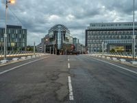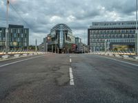 This stock photo features an empty road with some modern buildings in the background and a red traffic light at the top. The scene truly captures the essence of city life in Berlin, Germany. The road surface is smooth asphalt, leading straight down the road towards the bustling business district. The architecture showcases modern urban design with impressive office buildings and a bridge. The dramatic clouds in the sky add a touch of drama to the scene, creating a captivating cityscape. The image embodies the vibrant energy and modernity of Europe's financial district.