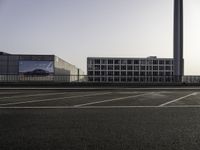 a parking lot with cars parked on it and buildings behind it with sky scrapers