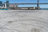 This stock photo features an urban cityscape in San Francisco with a beautiful sea view. The image shows an empty parking lot with car tires painted on the asphalt surface, and a boat dock can be seen in the background. The vibrant coastal city is bathed in sunlight, with a clear sky and the ocean stretching out towards the horizon. The pier and jetty provide a striking element in the composition, complementing the city's skyline. This packshot captures the urban charm and coastal atmosphere of San Francisco on a bright and open day.