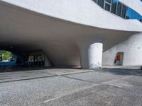 A white building sitting under a bridge in front of it in Taichung City, Taiwan. The urban design of the city blends modern architecture with open spaces. This image captures the vibrant atmosphere of the city during the day, showcasing the library as a prominent feature of the urban landscape.