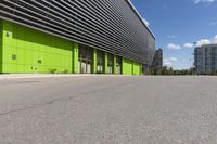 Modern architecture in Toronto, Ontario. The facade of a building with a green wall overlooks the urban cityscape. Daytime clouds loom over a busy plaza and a parking deck. A true representation of city life in Canada.