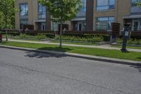 Urban cityscape in Toronto, Ontario. Cars drive down the asphalt road surrounded by residential buildings and lush green grass. Tall brown building stands against a backdrop of trees. Vibrant urban design in the heart of Canada.