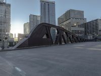 A stunning view of the Chicago skyline at dawn, with clear skies and a concrete street leading towards the city center. The vibrant cityscape showcases the architectural marvels of this metropolitan area in Illinois, USA.