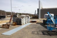Urban construction site in Bristol, Tennessee. Grey sky creates a moody backdrop for the concrete and asphalt landscape. Forklift and metal truck dominate this bustling architectural scene.