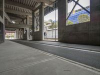 a street in an empty building that's partially painted gray with the top half up and bottom down