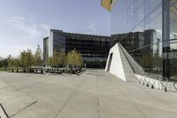 an urban courtyard with various benches and trees near a building under a clear sky with some buildings in the background