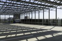this is a picture of a covered area with concrete floors and a large roof and some windows