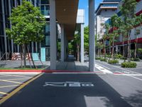 a red crosswalk sits next to tall buildings in an urban area, near a pedestrian crossing