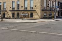 This photo captures the essence of urban life in Toronto, Ontario, Canada. The image features an empty street with a brick building and a sign for Dynamite Pizza. The modern architecture and urban design are evident in the facade and entryway. The brick walls and asphalt road surface add to the city's character. A crosswalk and curb can be seen, highlighting the pedestrian-friendly nature of the neighborhood. This is a typical scene during the day in downtown Toronto, showcasing the city's vibrant and bustling atmosphere.