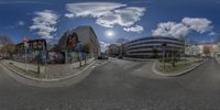 A panoramic view of a street in Berlin, Germany. Classic architecture and graffiti-covered buildings create a unique urban design. Azure skies complement the grey facades, while vegetation adds a touch of nature to the city. A vibrant snapshot of Berlin's city life.
