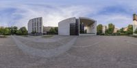 a spherical photo taken in front of some buildings that are connected to one another, with a parking lot below them