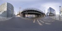 A fish-eye view of the vibrant city of Berlin, Germany. The architecture is a mix of modern buildings and historic facades. The street under the bridge creates an open space for city life. The sunlight casts dramatic shadows on the concrete and steel infrastructure.