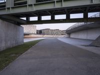 a paved pathway along a road below a bridge in a city with a river below