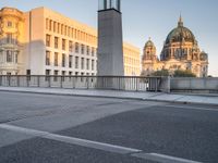 This image captures the essence of a bustling city at dawn in Berlin, Germany. The clear sky above the cityscape allows the beautiful architecture to shine. The classic and modern buildings stand tall against the backdrop of a vibrant metropolitan area. The road surface and landmarks, such as the bridge and the fire hydrant, are key features of this urban design. The street lights and traffic cones indicate the busy city life that takes place on this road. This photo showcases the mix of classic and modern architecture that defines Berlin's unique charm.