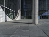 A modern architectural marvel in the heart of Berlin. Tall columns and concrete pillars create a stunning structural element. Shadows from large windows add depth to the urban design. A perfect representation of city life in Europe.