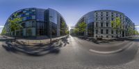 A modern architecture building in Berlin, Germany. The curved facade and straight road create a symmetrical and urban design. The sunlight casts hard shadows on the white building. A snapshot of city life in Europe.