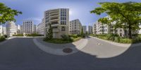 A modern cityscape in Berlin, Germany. Tall high-rise buildings with sleek facades line the road. The clear sky and open space create a sense of urban design and infrastructure. Trees add a touch of nature to the bustling city scene.