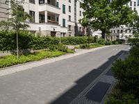 This is an image of a modern residential area in Berlin, Germany. The architecture combines modern design with traditional elements, such as cobblestone streets and tree-lined roads. The buildings cast long shadows on the asphalt road surface, adding a sense of depth to the scene. The well-maintained grass and vegetation provide a green contrast to the urban surroundings. This photo captures the essence of city life in Berlin, with its mixture of modern and traditional architecture, creating a vibrant and dynamic urban design.