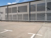 This stock photo showcases a vacant basketball court in the bustling city of Berlin. The court is surrounded by a tall steel building adorned with several rows of sliding gates. The architecture of the building, combined with the urban setting and cobblestone road, creates a striking contrast. The image captures the essence of urban design in Berlin, with its concrete streets and modern wall structures. It's a perfect representation of the city's vibrant atmosphere during the day. The photo also highlights the presence of a parking deck nearby, adding to the overall urban feel of the scene.