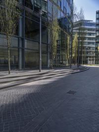 This is an image of a modern office building in Berlin, Germany. The glass walls reflect the cityscape, showcasing the urban design and architecture of the metropolitan area. The building is located in a bustling business district, surrounded by roads and cobblestone streets. The tree-lined public spaces add a touch of greenery to the city environment. This photo captures the vibrant city life and represents the intersection between modern architecture and historical cobblestone streets, showcasing the unique blend of old and new in Berlin.