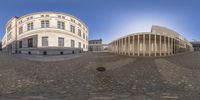 A panoramic view of a modern office building in Berlin, Germany. The monochromatic facade and straight road create a symmetrical urban design. The clear sky reflects on the building's windows, adding to the city life vibe.