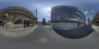 two 360 - panes of a large industrial city street with an overpass and a tunnel