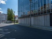 Berlin's modern architecture showcased through glass-walled office buildings in vibrant city life. Hard shadows cast on asphalt roads highlight Europe's urban design in Germany. A sunny day in the business district.