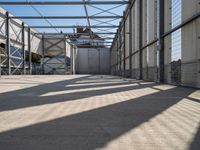 This photo captures the urban design of a city in Europe, specifically Berlin, Germany. The image shows a straight road in an open space, with modern architecture and concrete streets. The clear sky above casts hard shadows on the pavement and the unfinished building with windows and metal construction on either side. This scene represents the city life and urban landscape of Berlin, showcasing the combination of architectural design and public spaces. The photo also highlights the unique flooring and facades that are characteristic of this European city.