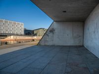 A modern urban landscape at dawn in Berlin, Germany. Clear sky reflects on the surface of the river. Concrete walls and underpasses blend with the city's modern architecture and urban design.