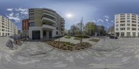 A modern residential building in Berlin, Germany. The clear sky reflects on the sleek architecture, while bicycles parked in front add to the city life atmosphere. A view from inside a 360 camera lens captures the urban design of the neighborhood.