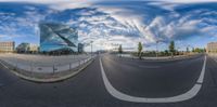 A fisheye lens captures a bustling cityscape in Berlin. The modern architecture and glass facades reflect the clear sky and sunlight. The road surface and thoroughfares lead to high-rise buildings and residential areas. A symmetrical landscape with a mix of business and residential districts.