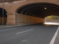 An urban road in the city with a bridge and an underpass. The road surface is made of asphalt and lined with brick curbs. Hard shadows create an urban design element.