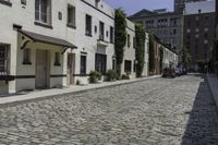 This is an image of a cobblestone path in the city's old town square. The path is lined with buildings and vegetation, creating a charming urban design. A bicycle and car can be seen on the sidewalk, adding to the lively atmosphere. The cobblestone flooring and road surface give the area a historic feel. This photo represents a residential area in the heart of the city, where old meets new in a unique blend of charm and convenience.