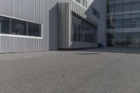 the side of a warehouse building next to a bicycle racket and garbage can on a concrete ground