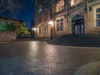 A nighttime view of an urban business district. Office buildings with artificial light illuminate the dark city streets. Brick and stone surfaces contrast with the clear sky. Urban design highlights the open spaces and business opportunities.