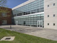 This image showcases a modern high-rise building with large windows, located in a vibrant urban city. The building's facade is made from concrete and glass, with a lush grass surface surrounding it. The clear sky and sunny weather create a bright and inviting atmosphere. The structure represents the modern architecture and urban design found in business districts. The image captures the essence of city life and the bustling atmosphere of an urban setting. This photo is perfect for showcasing architectural concepts, urban planning, and the integration of nature in city surroundings.