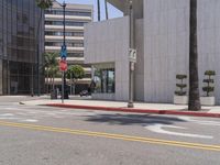 This is an image of a modern architecture building in the bustling city of Los Angeles, California, USA. The building features a facade with large windows and a yellow line marking the road surface. Surrounding the building are trees and urban infrastructure, including parking lots, curbs, and thoroughfares. The image captures a busy day in the business district, with people and motor vehicles passing by. The urban design of the area is characterized by the mix of office buildings, shops, and storefronts. In the distance, a crosswalk or zebra crossing is visible, indicating pedestrian activity in the area.