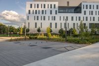 This image captures the urban landscape of Toronto, Canada. In the foreground, an empty sidewalk leads to a large white building with black windows. The modern architecture stands tall against the sky, while the clouds add depth to the scene. The concrete road surface and grassy land lot provide a contrast of textures. The hard shadow creates interesting patterns on the ground, highlighting the urban design. This photo represents the bustling business district of Toronto, where modern architecture and open spaces coexist.