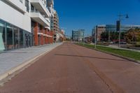 This photo captures an urban scene in Toronto, Ontario, Canada. The clear sky provides a bright backdrop to the modern office building and business district. The empty street, lined with parking meters and curbs, leads straight down the road. The smooth asphalt and tar of the road surface add to the sleek urban design. The photo depicts a typical day in the bustling city, where business and urban life meet. The glass facade of the building reflects the openness and vibrancy of the city.