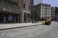 A city street lined with tall buildings and trees. The asphalt road and flooring contrast with the green vegetation. Urban design and infrastructure create a vibrant human settlement.
