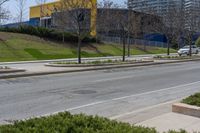 This is an image of an empty street in Toronto, Ontario, Canada. The street is surrounded by tall buildings and trees. The urban landscape showcases modern architecture and urban design. The road surface is made of asphalt and the foreground features grass and trees. This photo represents a typical day in the city, capturing the bustling city life in a residential suburb. The tall buildings create a dramatic backdrop, while the empty street emphasizes the quietness and tranquility of the scene.