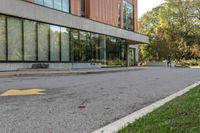 This is an image of a suburban street in Toronto, Canada. The empty road stretches through a residential area, with buildings featuring various facades lining the street. Tall trees and vegetation can be seen in the background, adding a touch of nature to the urban setting. The road surface is made of asphalt, and a person can be seen walking on the sidewalk. This photo represents a typical day in a Toronto suburb, showcasing the blend of urban design and natural elements.