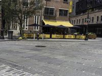 A view of a city's residential area with buildings lining the streets. The asphalt road surface is flanked by trees, while the facade of the buildings feature different tints and shades. The urban design includes windows and curbs, creating a vibrant and lively neighborhood.